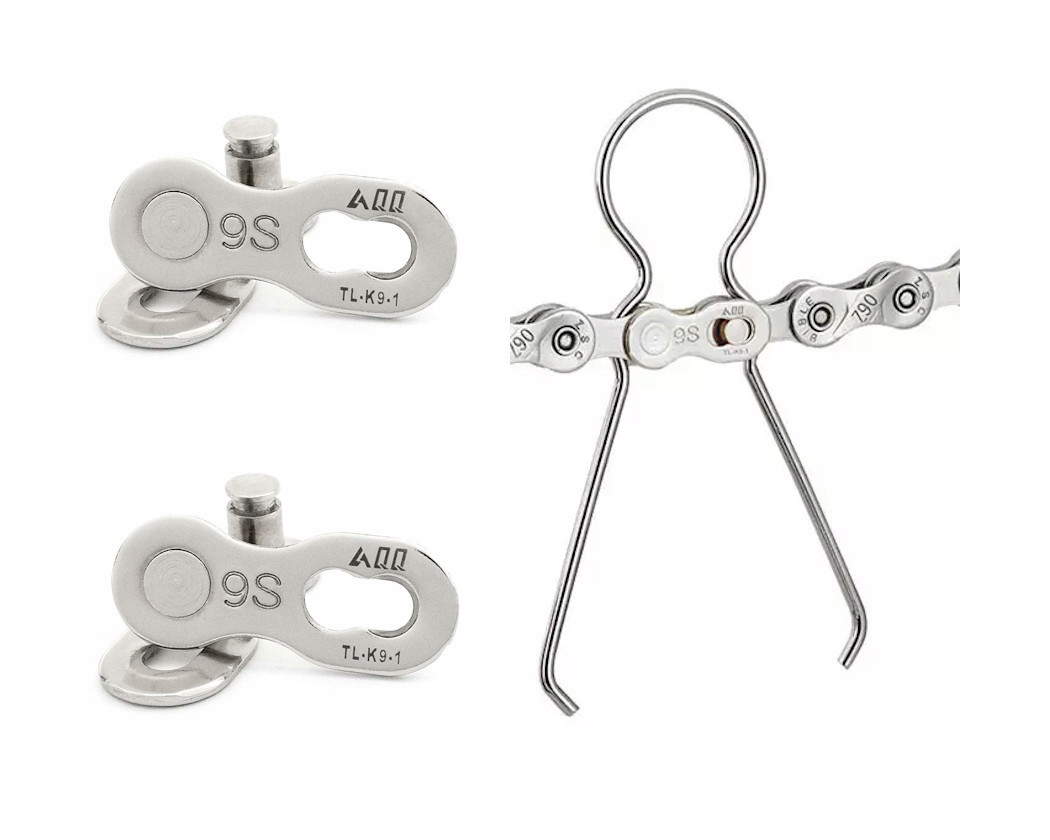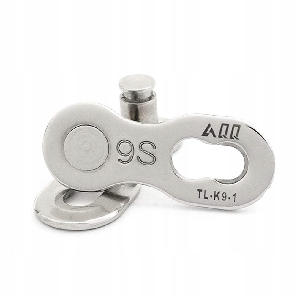 Ogniwo złączne, srebrne, przeznaczone do zębatek 9-rzędowych. W zestawie 2szt. spinki oraz szczypce pomocne przy montażu i demontażu.