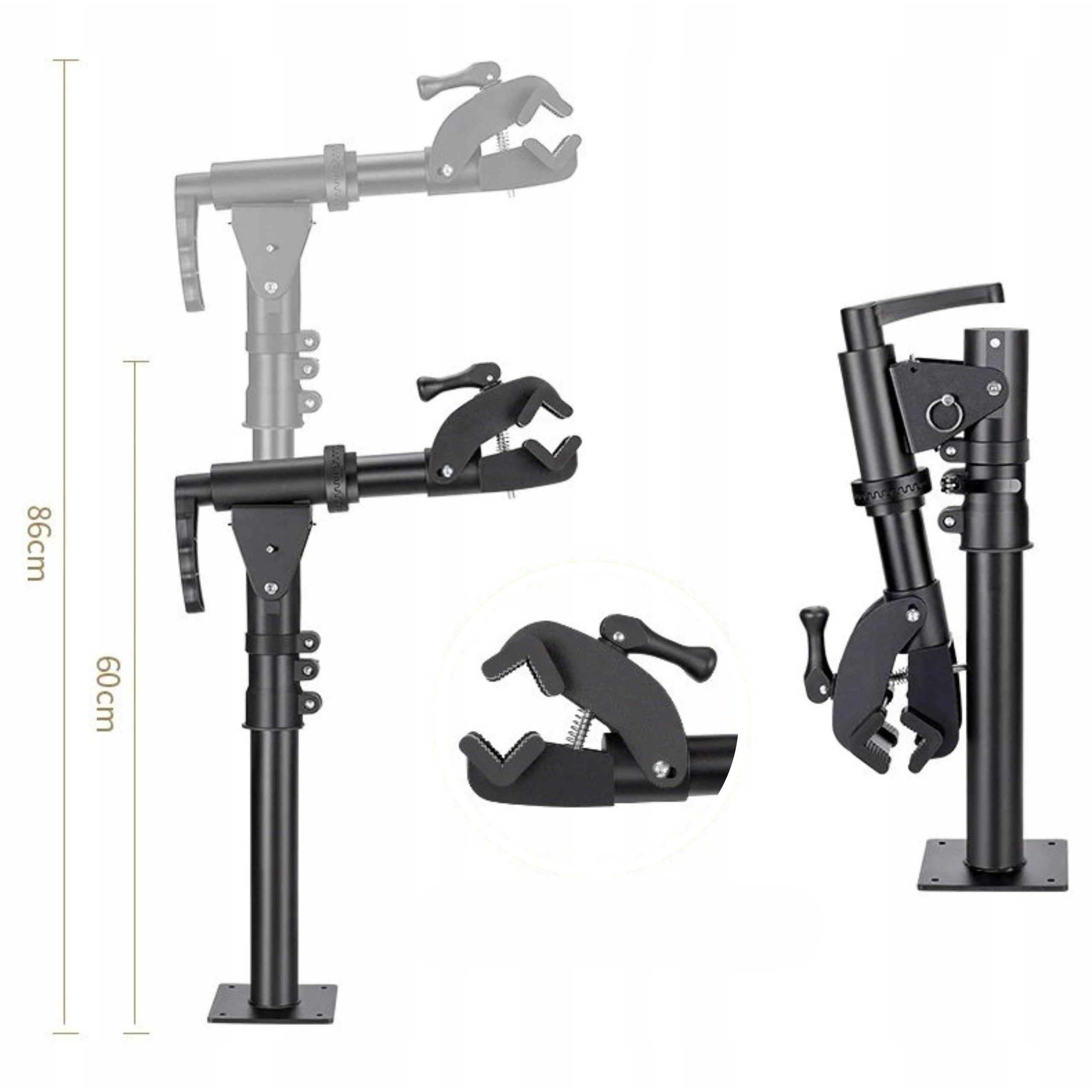 Kompaktowe wymiary: regulacja wysokości od 60 do 86 cm pozwala na dostosowanie stojaka do różnych potrzeb, a możliwość montażu na blacie sprawia, że jest idealny do mniejszych warsztatów